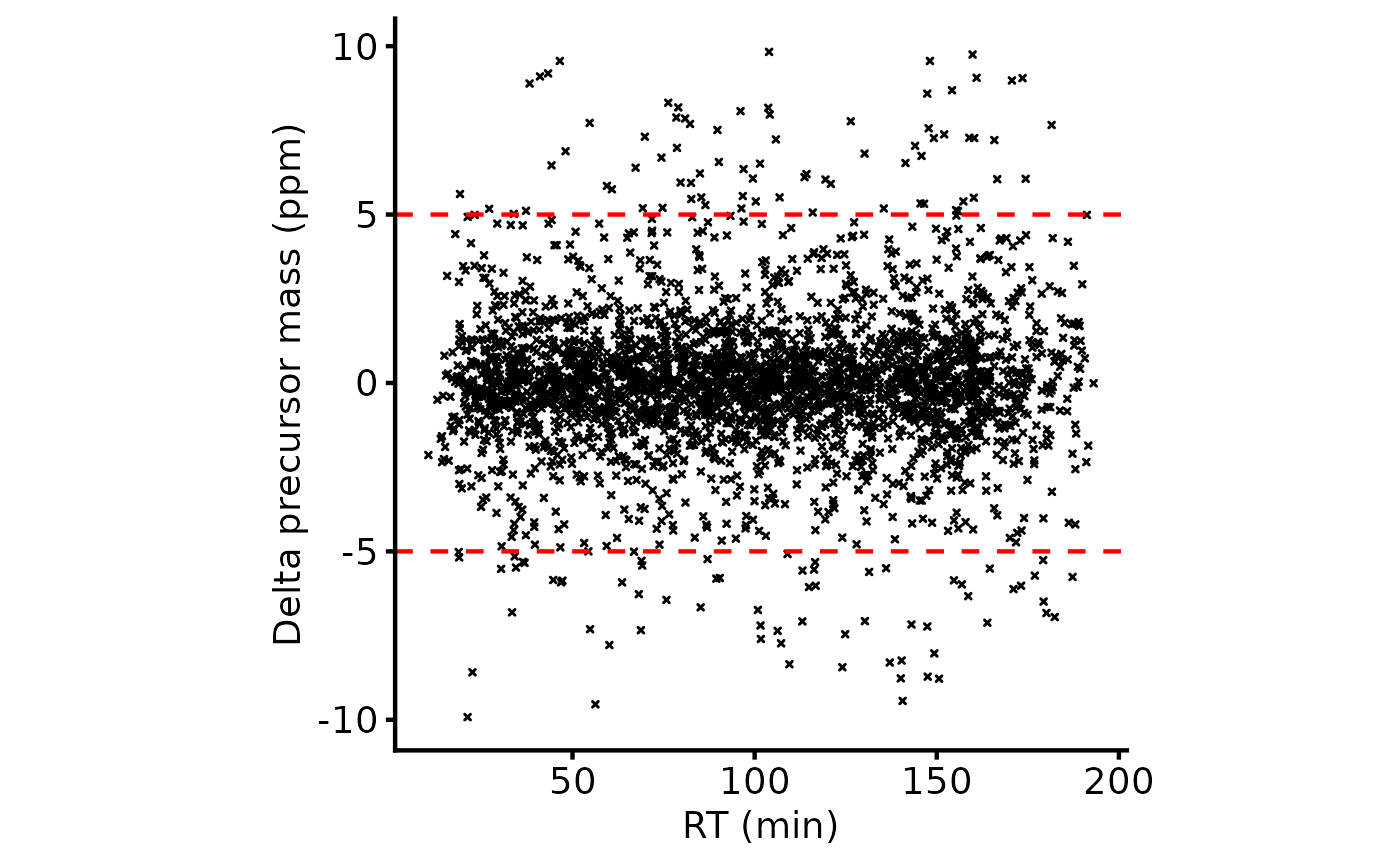 tmt_qf[['peptides_raw']] <- add_gene_long_protein_name_pd(tmt_qf[['peptides_raw']])It’s helpful to assess the retention time (RT) for the peptides and the relationship with the delta mass for the precursor ion. Everything looks OK here.